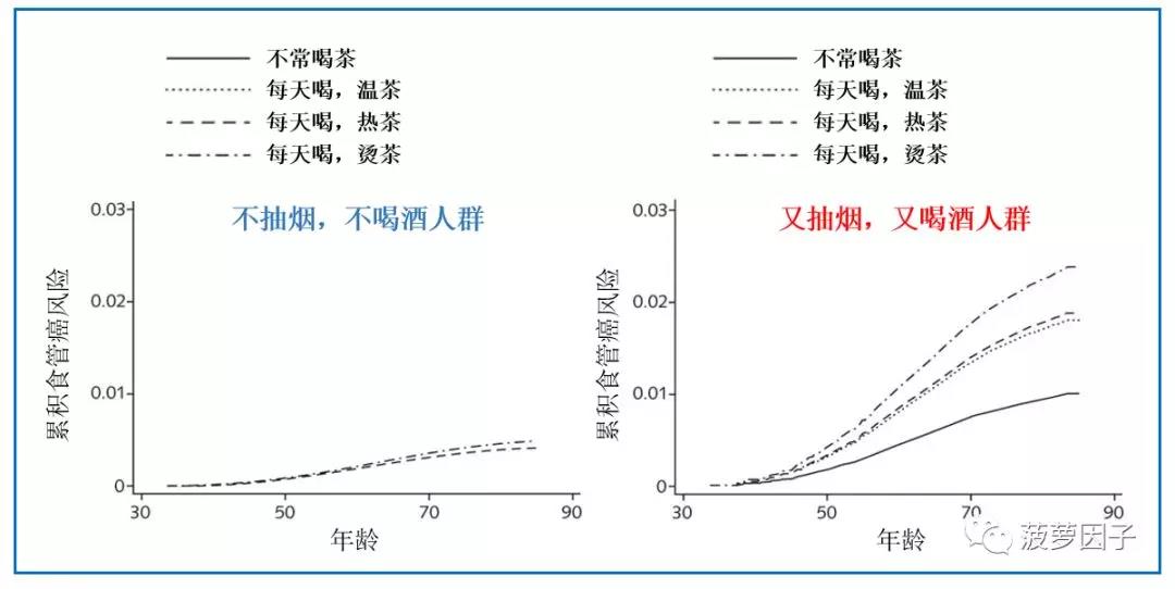 看起来,喝烫茶像是一种催化剂,单独导致食管癌的风险很小,但它会进一步增加别的致癌因素(比如吸烟或喝酒)的风险!